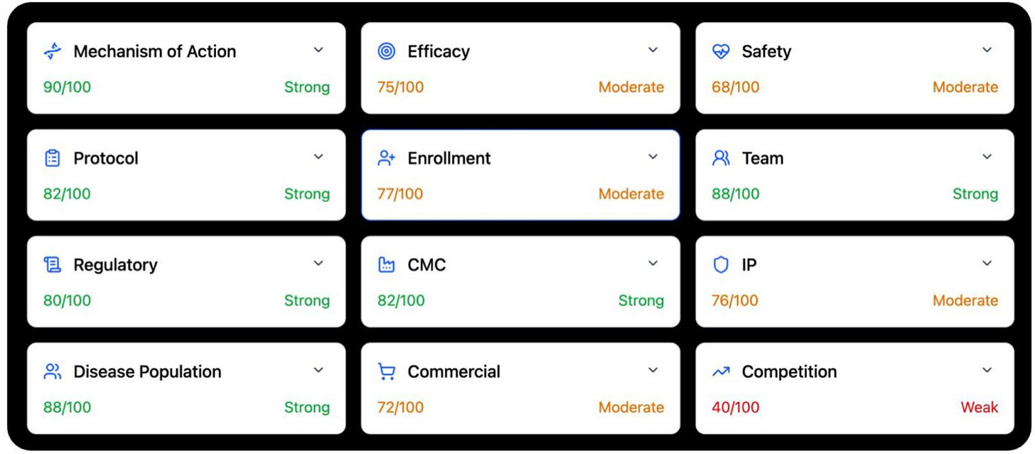 A strong mechanism can be ruined by weak protocol design. Good efficacy can be capped by safety. A well run program can still lose on enrollment. A good drug can fail in the market. A strong asset can be boxed in by weak IP. A promising program can be overtaken by competition.