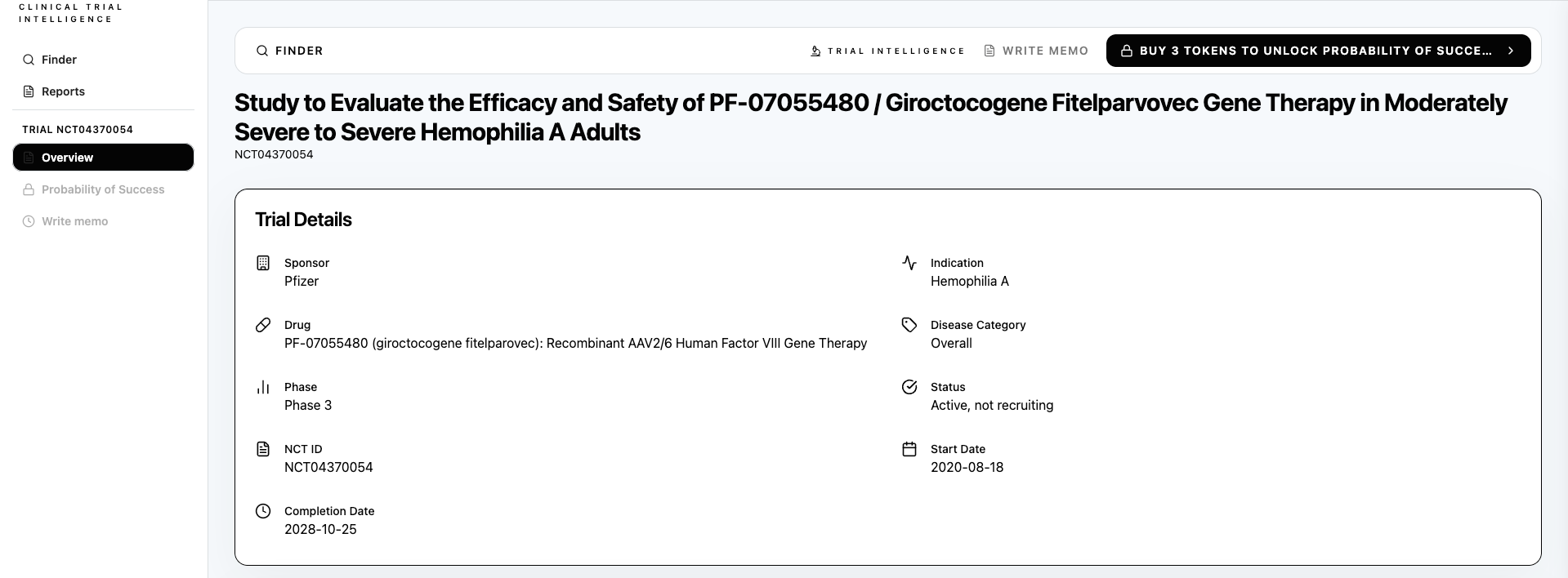 Retrieve any registered clinical trial that is ongoing for probability of success analysis with Panoptic Bio. Shown here: Gene Therapy for Hemophilia A, a clinical trial by Pfizer. Panoptic Bio’s clinical trial intelligence shows an above-benchmark Probability of Success from Phase 3 to market for Pfizer’s gene therapy, with the potential to serve more than 300,000 patients globally living with Hemophilia A.