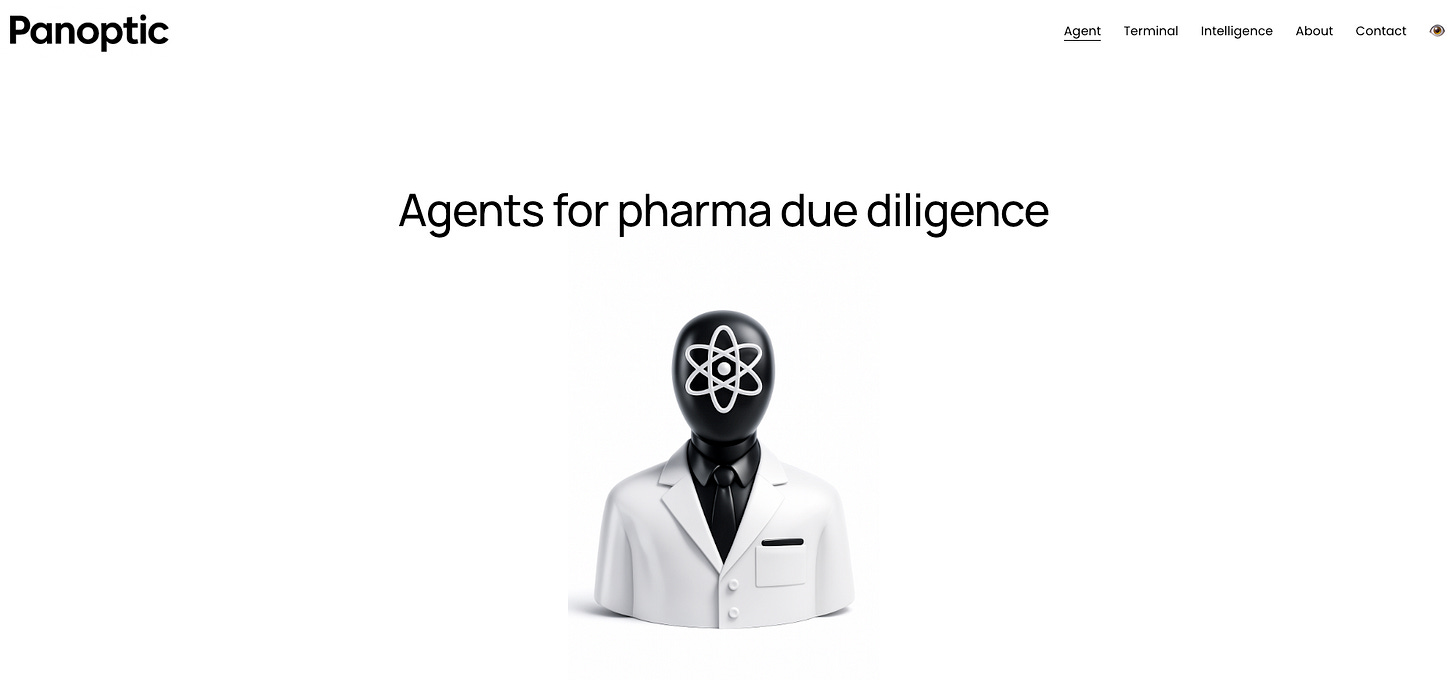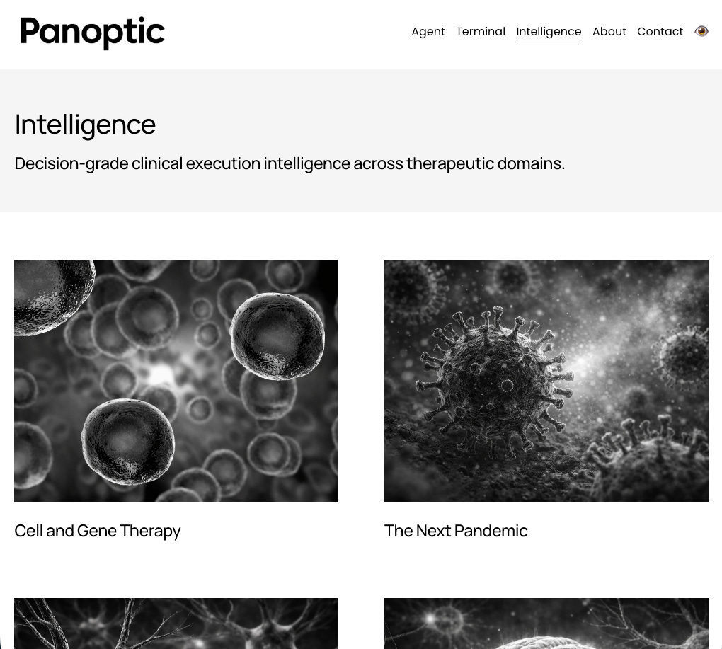 Panoptic Bio is a pharma intelligence company based in Mountain View, CA. Shown here the www.panoptic.bio website with several pharma agents for hire, the Trial Terminal, and public intelligence reporting available.