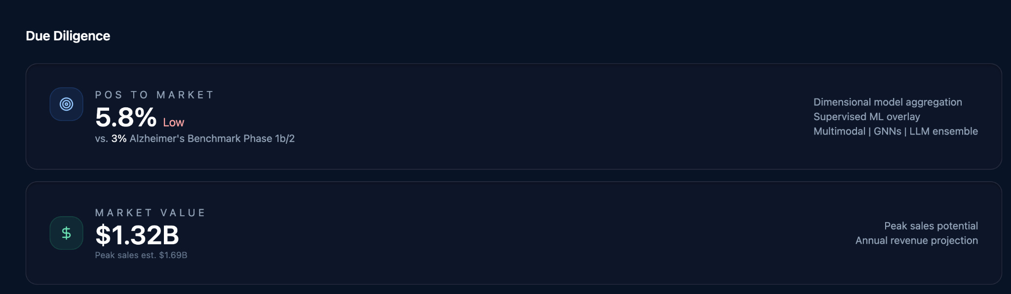 Once probability is established, value can be modeled. The agent performs market analysis, builds pricing and adoption assumptions, constructs discounted cash flow models, and runs sensitivity analyses.